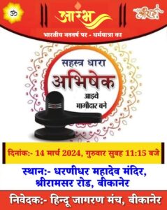 मंच की ओर से जारी प्रेस विज्ञप्ति के अनुसार प्रतिवर्ष भारतीय नववर्ष पर हिन्दु जागरण मंच की और धर्मयात्रा एंव महाआरती का आयोजन किया जाता है। इस धर्मयात्रा और महाआरती का आयोजन करने से पूर्व हिन्दु जागरण मंच सर्वप्रथम महादेव का सहस्त्र धारा अभिषेक किया जाता है। इसी क्रम में मंच की और से यह कार्यक्रम आयोजित किया जा रहा है। धरणीधर महादेव मन्दिर, बीकानेर में किया जाएगा। इसमें हिन्दु जागरण मंच के कार्यकर्ताओं के साथ साथ आमजन ने भी भागीदारी रहेगी।