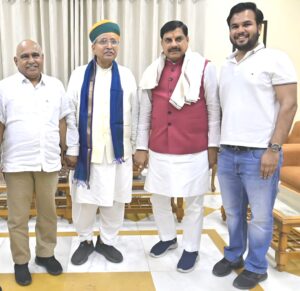 बीकानेर केंद्रीय कानून मंत्री अर्जुनराम मेघवाल के निवास पर आज भाजपा युवा मोर्चा महामंत्री पंकज अग्रवाल ने मध्यप्रदेश के मुख्यमंत्री मोहन यादव व प्रदेशाध्यक्ष हेमंत खंडेलवाल से मुलाकात कर बीकानेर आगमन का निमंत्रण दिया। मोहन यादव से कहा जल्द ही मेघवाल संसदीय क्षेत्र का कार्यक्रम बनकर बीकानेर आएंगे।