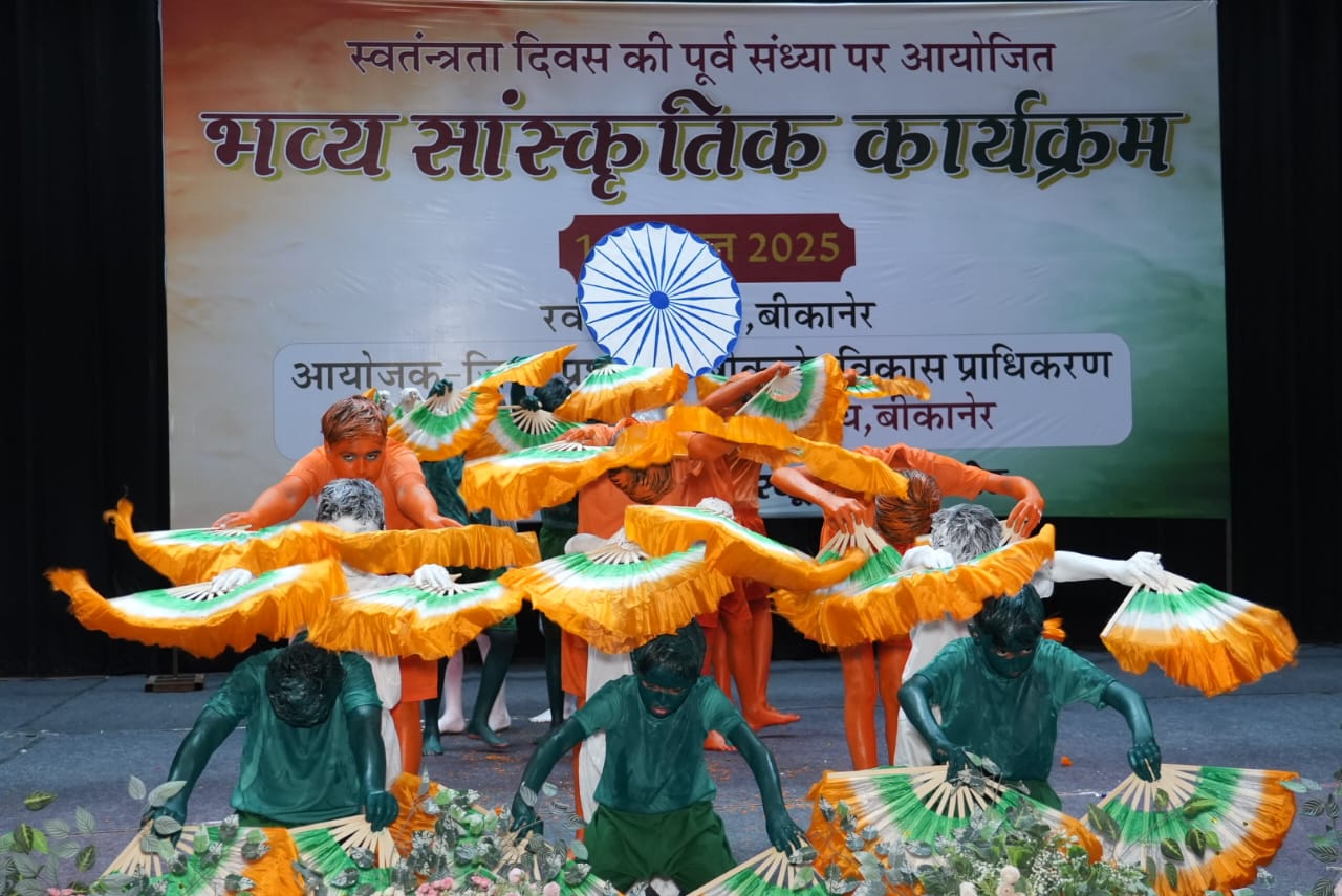 स्वतंत्रता दिवस की पूर्व संध्या पर गुरुवार को रवींद्र रंगमंच पर भव्य सांस्कृतिक कार्यक्रम आयोजित किया गया। जिला प्रशासन, बीकानेर विकास प्राधिकरण और जनसंपर्क कार्यालय के संयुक्त तत्वावधान में आयोजित कार्यक्रम में जिले के विभिन्न स्कूलों के विद्यार्थियों ने देशभक्ति गीत नृत्य, लोक संगीत और संस्कृति आधारित गीतों और नृत्यों की प्रस्तुतियां देकर रवीन्द्र रंगमंच को देशभक्ति के रंगों से सराबोर कर दिया।