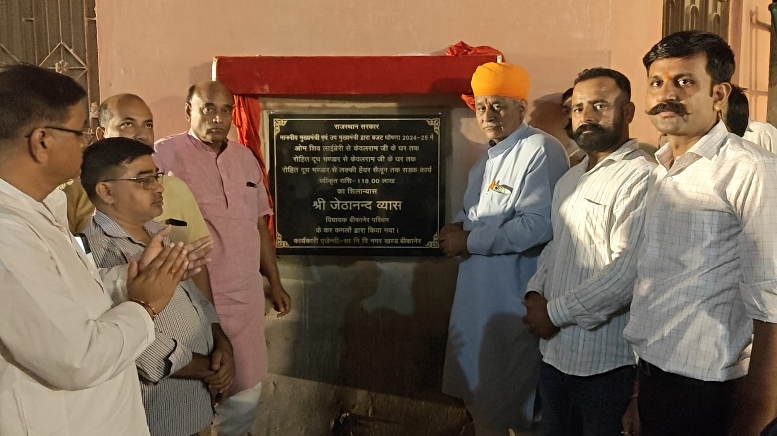 बीकानेर (पश्चिम) विधायक जेठानंद व्यास ने रविवार को दो सड़कों का शिलान्यास किया। विधायक ने बंगलानगर में ओम शिव लाइब्रेरी से केवल राम के घर तक, रोहित भंडार से केवलराम के घर तक और रोहित दूध भंडार से लक्की हेयर सैलून तक 118 लाख रुपए की लागत से बनने वाली सड़क तथा सर्वोदय बस्ती में सुरजा राम कूकणा के घर से अर्जुनराम के घर तक तथा रामदयाल सारण के घर के पास वाली गली, भैरूंजी मंदिर से पूगल रोड तक 121 लाख रुपए की लागत से बनने वाली सड़क का शिलान्यास किया।