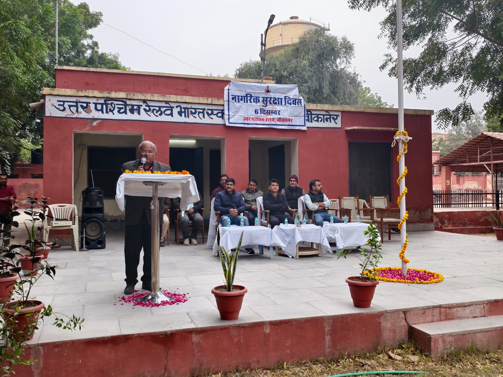 उत्तर पश्चिम रेलवे बीकानेर मंडल की ओर से नागरिक सुरक्षा दिवस कार्यक्रम आयोजित किया गया। इसमें संरक्षा संगठन ने विपरित परिस्थितियों में नागरिकों को सुरक्षा प्रदान करने के गुर बताए।