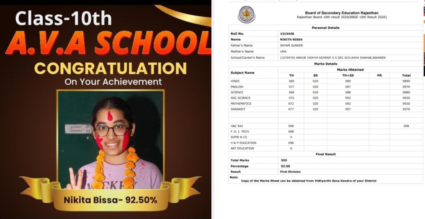 दसवीं बोर्ड परीक्षा में निकिता बिस्सा(ऋषिका) पुत्री श्याम सुंदर ने 92.50 प्रतिशत अंक हासिल कर परिवार को गौरान्वित किया है। निकिता अंकुर विद्या आश्रम स्कूल की छात्रा है। निकिता की उपलब्धि पर परिवारजनों में खुशी की लहर दौड़ गई है।